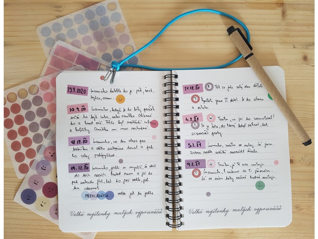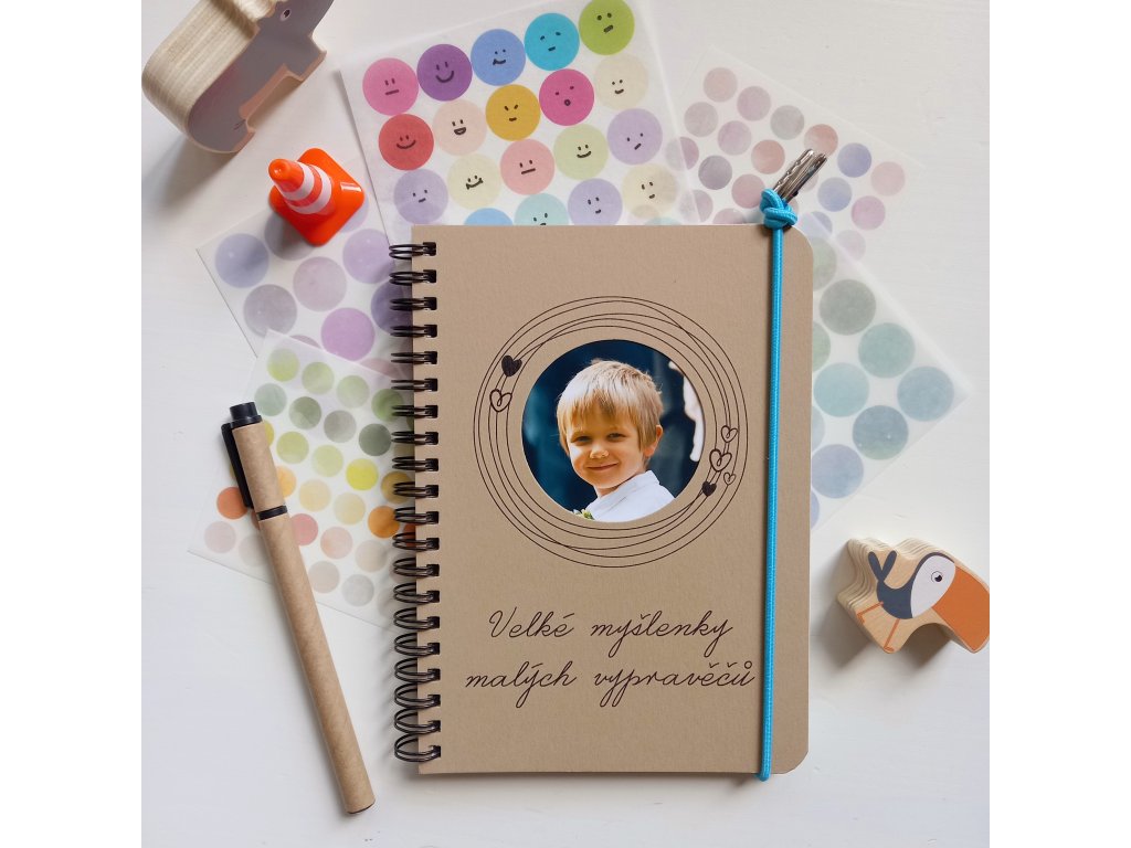 Zápisník má dvojité desky, mezi které nalepíte fotku svého vypravěče, případně společnou fotku více dětí.