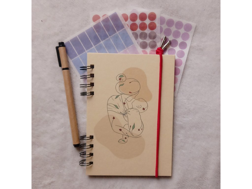 Zápisník má pevné desky potištěné motivem, který si zvolíte. Svázán je kroužkovou vazbou.